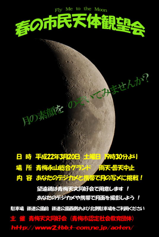 | ・月の素顔を見てみませんか? 〜Fry Me to the Moon〜私を月まで連れてって ・携帯やデジカメで月の写真を撮ろう! いつも使っている、携帯やデジカメで写してみよう! ・いつも何気なく見上げている月、実は地球上の自然や生命に大きな影響を与えています。 ・あまり変化が無いように見える月も、その満ち欠けや見える時間、位置、季節。また、 見上げる人の心模様によって、実にさまざまな表情を見せてくれます。 ・この機会に 神秘的な月の素顔を ご自分の目で確かめて見ませんか。 ・観望会当日会場で皆様のお越しをお待ちしています。 |
