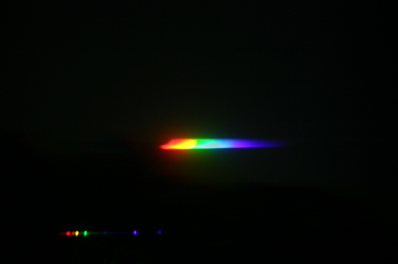 五藤光学製のプリズムによる、分光写真 中央が月(三日月形の月)、左下が水銀灯 (撮影:会員の森澤さん) |