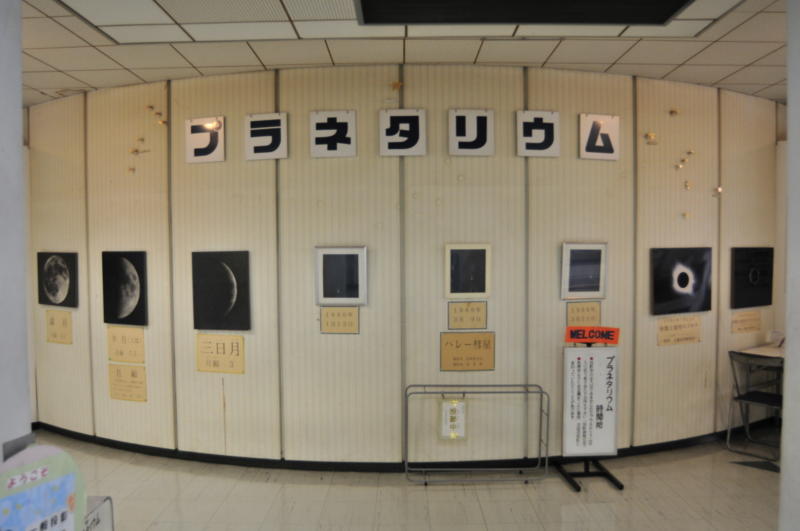 教育センタービル3Fのエントランス 階段を昇りきって右を向くと、丸い投影室の 外壁沿いに、展示された天体写真と伴に、 プラネタリウムの表示で来館者を迎えます。 |