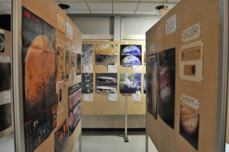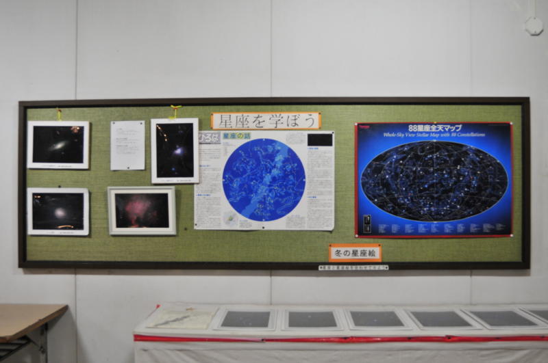 天体情報が展示された西側館内 エントランスを左に行くと壁面には、 その時々に見え る天体の情報や、 奥のパーテーションに区切られた スペースに天文学の基本的な事 柄の展示や気象の基礎知識が紹 介されています。 |