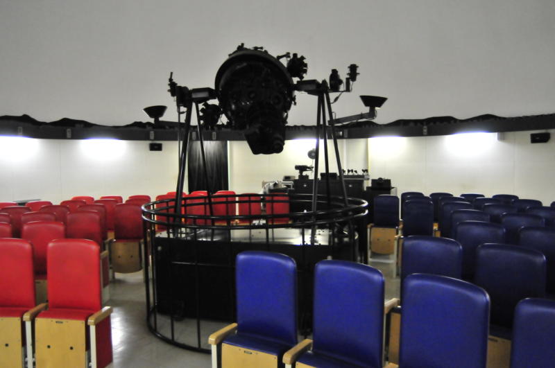 リクライニングシートのプラネタリウム投影室 南側の入口からプラネタリウム投影室に入ると、 約10メートルの円形の部屋の真ん中に、 プラネタリウム投影機。 それを囲むように、青と赤いリクライニングシートが、 南向きに並びます。 北側には、解説者の立つコントロールがあります。 見上げると白色の丸天井(ドーム)が拡がります。 |
