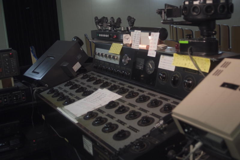 アナログダイヤルによるコントロール アナログダイヤルがずらりと並んだ圧巻のコントロール パネル。他にも色々な補助投影機が所狭しと並んで 居ます。 |