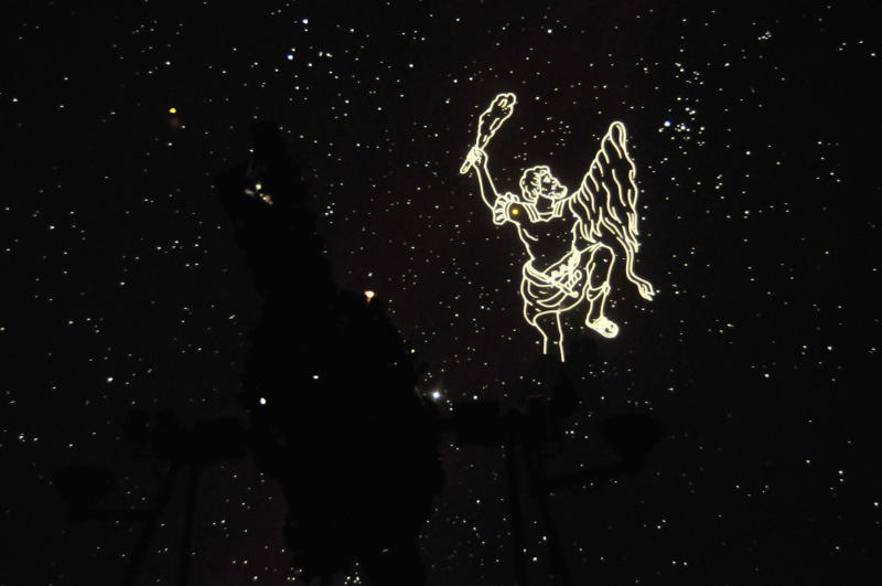 星座絵図 星空に重ねられたオリオン座の星座絵図。 星空に星座の絵を重ねて投影することで、 イメージがつかみやすくなります。 |