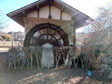 駅から南に槻川へ向かう通りには、洒落た万葉歌碑のプレートが、歩道沿いにいくつもしつらえられているので、それを読みながら行く。槻川は、万葉にゆかりのある川らしい。橋を越えた川沿いは、右手の西方面が公園になっている。水車のある公園をぬけて、遊歩道を行く。次の橋を北に渡って、穴八幡古墳を目指す。車通りへ出て、西にあるコンビニのところから、右手の道を行くと、すぐに古墳にたどり着く。