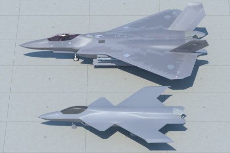 最近はGCAP-次期戦闘機をイメージした大型のステルス戦闘機ばかり作っていたので、小型のステルス戦闘機を作りたくなり、F-26のモデリングを始めました。F-26はF-16程度の大きさの機体で、F-47や(F-47の機体形状は公開されていませんが)、マクドネル・ダグラス(ボーイング)X-36を参考にして、モデリングを行なっています。 二枚目のイラストはF-309Aと並んだF-26です。F-26の機体サイズでウェポンベイにどれだけ武装を搭載できるか不安ですが、まずはこのままモデリングを進めるつもりです。 またF-26という名称は、2011年にこのページで公開したF-25の次の番号という事で付けています。