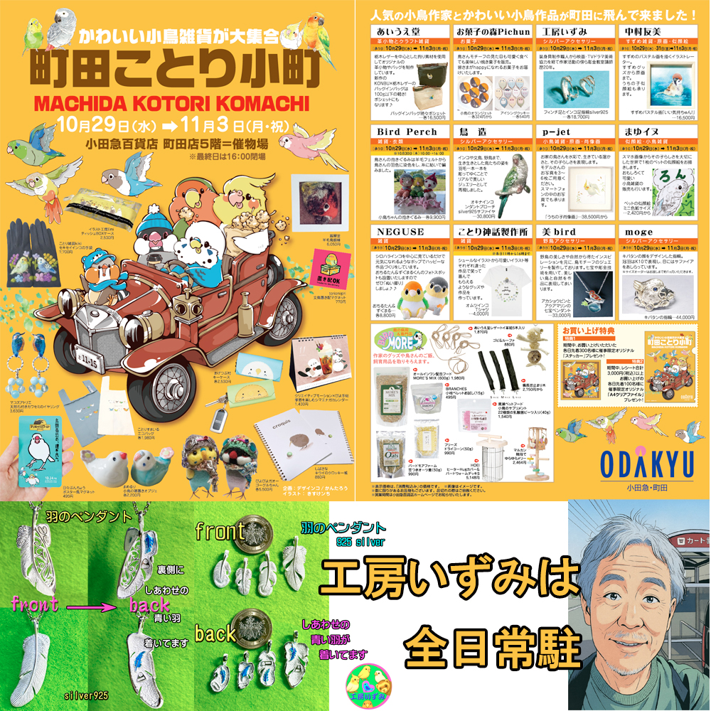 お知らせ 2025年10月14日のWindows11への切り替えが 未熟のため ホームページをしばらく 更新ができないと思いますので よろしくお願いいたします。 イベントの合間に頑張ります なお、2026年3月7日(土)、8日(日)は 【鳥フェス仙台】に初めて出店いたします