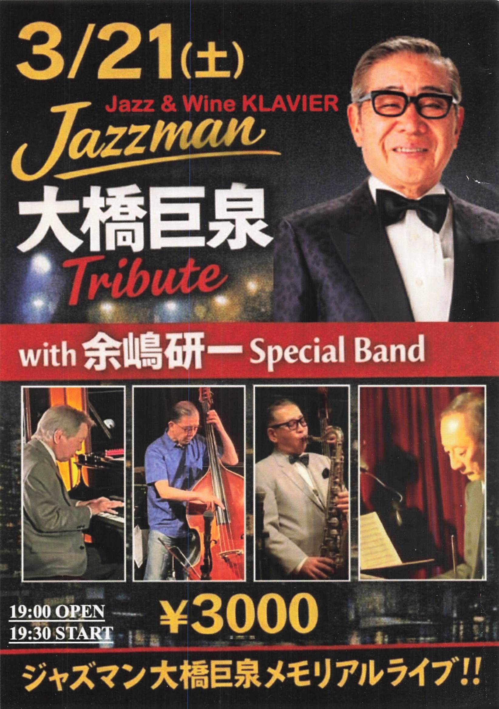 3/21(土) jazz man大橋巨泉メモリアル 余嶋研一(p)高尾幸宏(b)池貝政俊(ds)右近茂(ts)
