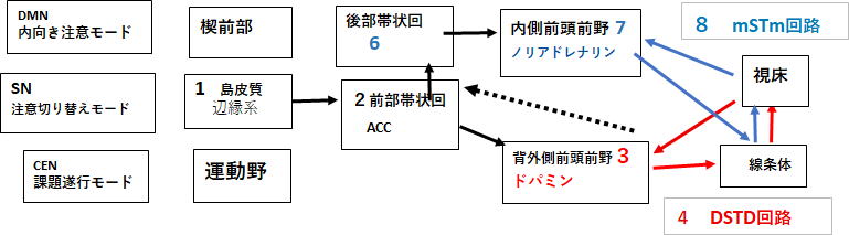 7 情報は後部帯状回経由で内側前頭前野 (mPFC)へ流れる。ここで、mPFC経由のCSTC回路(mSTm) 回路が作成される。線条体は辺縁系アトラクター回路の一部であり、DMNと親和性があるので、こ