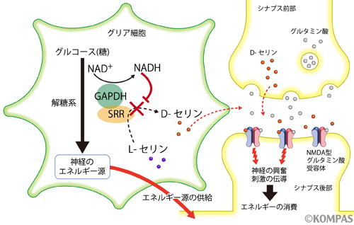 ③ グルタミン酸の主要な受容体はNMDA受容体で、この受容体が発火するには、受容体にDセリンとグリシンが結合 していて、そこにグルタミン酸が結合する必要がある。