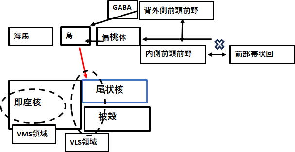 ・島皮質の5hT2受容体の感受性の低下は腹側線条体VLS領域へのグルタミン酸投射を減少させる。結果、直接路が賦 活する。