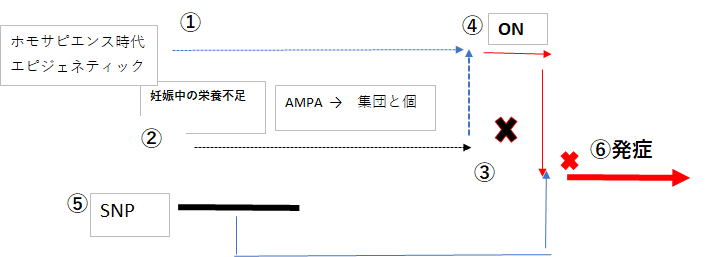 ここで初めて、摂食障害の必要十分条件になる、多因子の集合系が完成してしまいます。つまりは、エピジェネティック+SNPの連合系です。そしてこの条件のもとで、摂食障害の第一歩が記されてしまうのです。