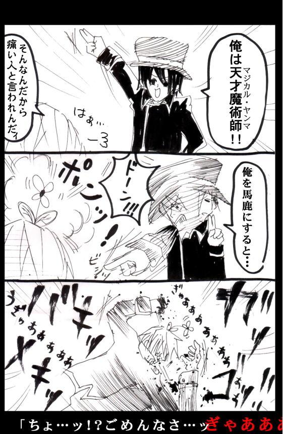 > 取り合えず気の済むまで殴る沖田… 横たわる山崎を見下ろしながら自分の拳に付いた山崎の血を”ペロリ”と舐める… そんな沖田を見て”ドキッ”とする退… …面白可愛い、バイオレンス山沖漫画に卑猥な感想を付けてしまってスイマセン;☆ (「…私が卑猥じゃないんだよ?!」と訴えてみる碧唯)