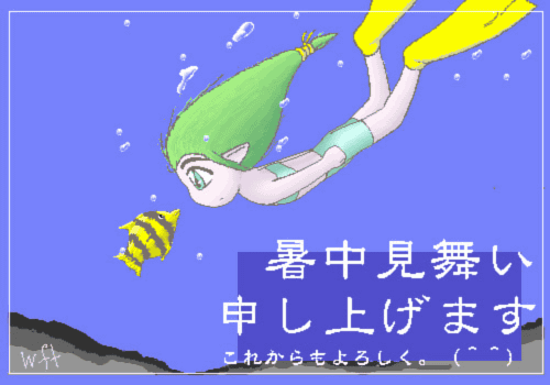 WFTさんの所へ遊びに行ったら、偶然(笑)暑中見舞いのCGを配っているのを発見、見事分捕ってまいったものであります。 実はこの魚、エルフ族の天敵、頭突き魚であるというから驚いておりましたら、作者曰く「戦闘直前の緊張感を描きたかった」という言を聞き、納得した所存にござります。 これからも分捕りに逝きますんでよろしく(´ー`)